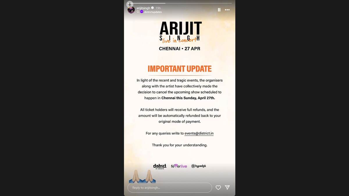 আসমুদ্র হিমাচলের শ্রোতা-অনুরাগীরা যার কনসার্টের জন্যে দীর্ঘদিন ধরে পথ গোনেন, শিল্পী এবং আয়োজকদের প্রতিবাদের এমন সিদ্ধান্তে কুর্নিশ জানিয়েছেন তাঁরাও। বৃহস্পতিবার অনুষ্ঠানের আয়োজকদের তরফে বিবৃতি প্রকাশ করে জানানো হয়, 'সাম্প্রতিক এবং মর্মান্তিক ঘটনার আলোকে, শিল্পী এবং আয়োজকরা সম্মিলিতভাবে আগামী রবিবার, ২৭ এপ্রিল চেন্নাইতে নির্ধারিত আসন্ন অনুষ্ঠানটি বাতিল করার সিদ্ধান্ত নেওয়া হয়েছে। যারা কনসার্টের টিকিট কেটেছিলেম প্রত্যেকে টাকা ফেরত পাবেন'।