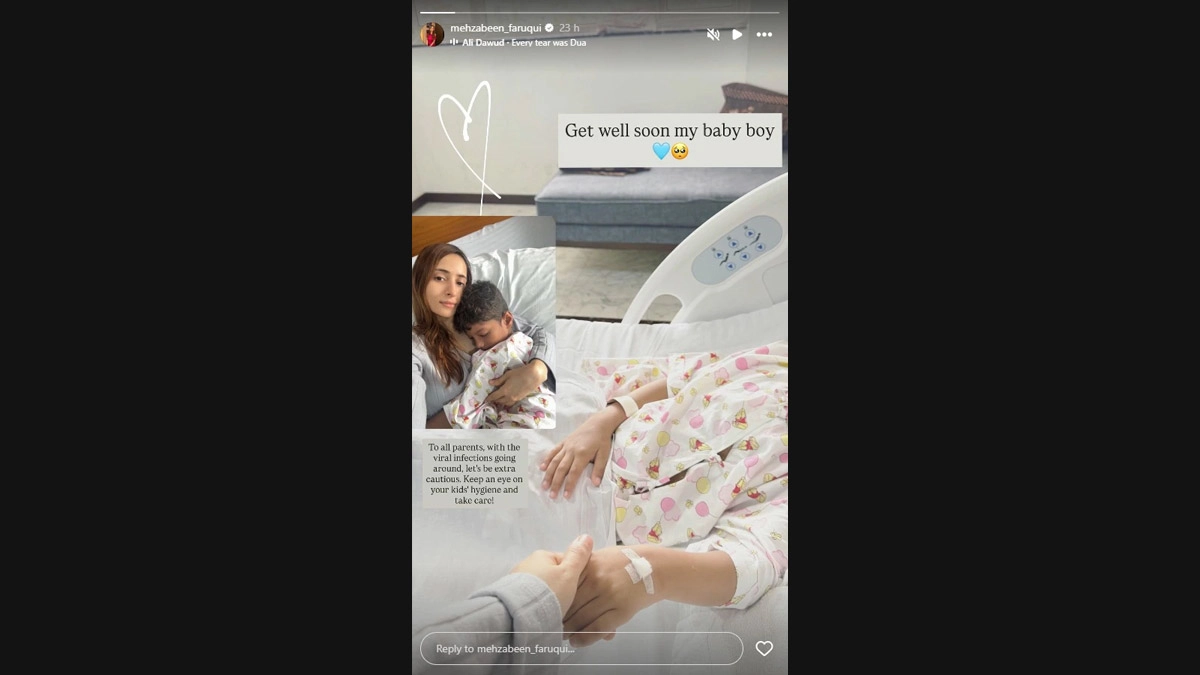 ছেলের অসুস্থতার খবর অনুরাগীদের সঙ্গে ভাগ করে নিয়েছেন মুনাওয়ারের স্ত্রী মেহজাবিন ফারুকি (Mehzabeen Faruqui)। মেহজাবিন তাঁর ইনস্টা স্টোরিতে হাসপাতাল থেকে ছবি শেয়ার করছেন। সেখানেই তিনি জানান, তাঁদের ছোট্ট ছেলে অসুস্থ। ছবিতে দেখা যাচ্ছে, মাকে জড়িয়ে শুয়ে রয়েছে খুদে ছেলে। আর একটি ছবিতে দেখা যাচ্ছে, হাসপাতালের বিছানায় শুয়ে থাকা ছেলের হাত ধরে রয়েছেন মেহজাবিন। অসুস্থ ছেলের হাতে চ্যানেল করা। ক্যাপশনে লিখেছেন, 'তাড়াতাড়ি সুস্থ হয়ে ওঠো আমার সোনা ছেলে'।