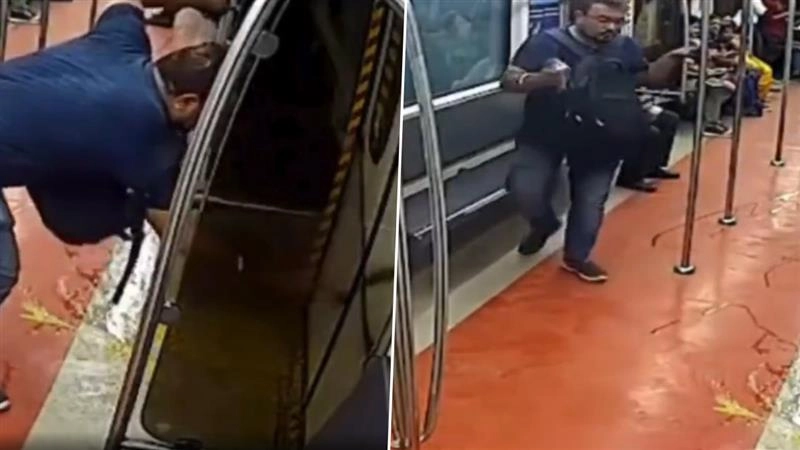 कोलकाता : चलती मेट्रो के गेट को शख़्स ने स्प्रे से गंदा किया