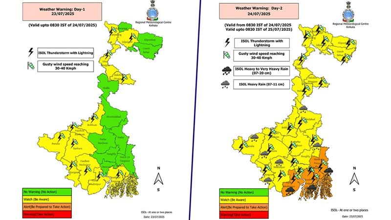 আজ পুরুলিয়া বাঁকুড়া বীরভূম পূর্ব পশ্চিম মেদিনীপুর ঝাড়গ্রাম পূর্ব বর্ধমান এবং দক্ষিণ ২৪ পরগনা জেলায় হলুদ সর্তকতা জারি করা হয়েছে। আগামীকাল উত্তর ও দক্ষিণ ২৪ পরগনা এবং পূর্ব মেদিনীপুর জেলার জন্য রয়েছে কমলা সর্তকতা।