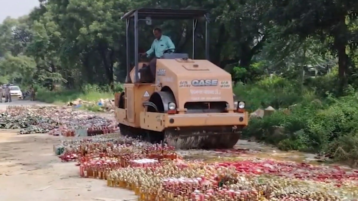 Gandhinagar, Gujarat: Police destroyed 39,552 bottles of foreign liquor in Koba area using a bulldozer. Liquor worth nearly ₹1.75 crore was destroyed, with over 100 police personnel present pic.twitter.com/BVMUlwugBu