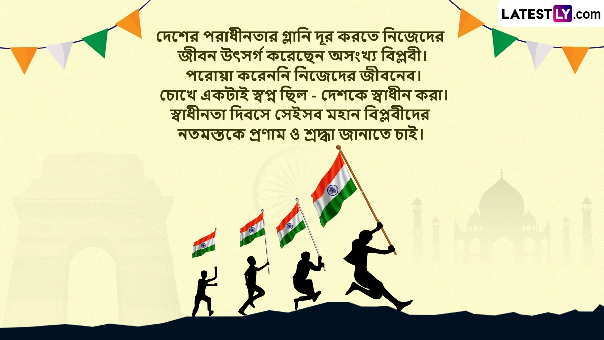 ভারতীয় ইতিহাসের পাতার উল্লেখযোগ্য একটি দিন স্বাধীনতা দিবস। এই দিনটির গুরুত্ব দেশবাসীর কাছে অপরিসীম। রাত পেরোলেই সারা দেশ এই উৎসবে সামিল হবে। তাঁর আগে স্বাধীনতা দিবস উপলক্ষে আপনি এই শুভেচ্ছা বার্তাগুলি অবশ্যই শেয়ার করুন।