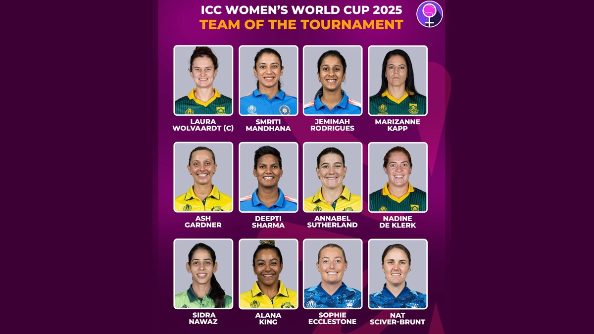 আইসিসি মহিলা ক্রিকেট বিশ্বকাপ ২০২৫-এর টুর্নামেন্টের সেরা দল ঘোষিত হল আজ। সেই দলে জয়ী ভারত দলের তিনজন খেলোয়াড়কে স্থান দেওয়া হয়েছে। ৩৯ রানে ৫ উইকেট শিকার করা প্রতিযোগিতার শীর্ষ উইকেট শিকারী দীপ্তি শর্মার সঙ্গে আছেন সতীর্থ স্মৃতি মান্ধানা এবং জেমিমা রদ্রিগেজ। এই ত্রয়ীর সঙ্গে যোগ দিয়েছেন টুর্নামেন্টের রানার্সআপ দক্ষিণ আফ্রিকার তিনজন খেলোয়াড় লরা ওলভার্ড, মারিজান ক্যাপ এবং নাদিন ডি ক্লার্ক এবং একই সংখ্যক অস্ট্রেলিয়ান - অ্যাশলে গার্ডনার, অ্যানাবেল সাদারল্যান্ড এবং আলানা কিং।