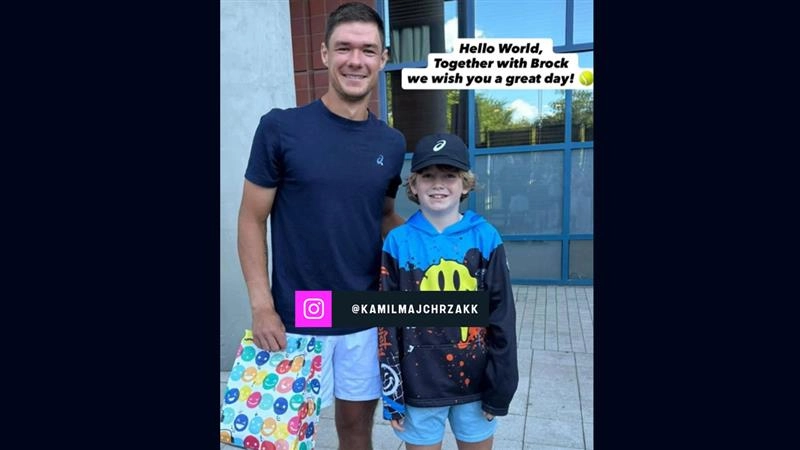 Kamil Majchrzak meeting the young boy who had the hat taken from him the other day at the US Open.
