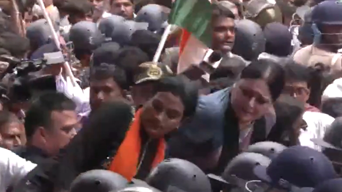 #WATCH | Kolkata | BJP MLA Agnimitra Paul and other protestors trying to remove the barricades set up by West Bengal police to contain them during the 'Nabanna Abhiyan' rally. pic.twitter.com/eZzeym5HI1