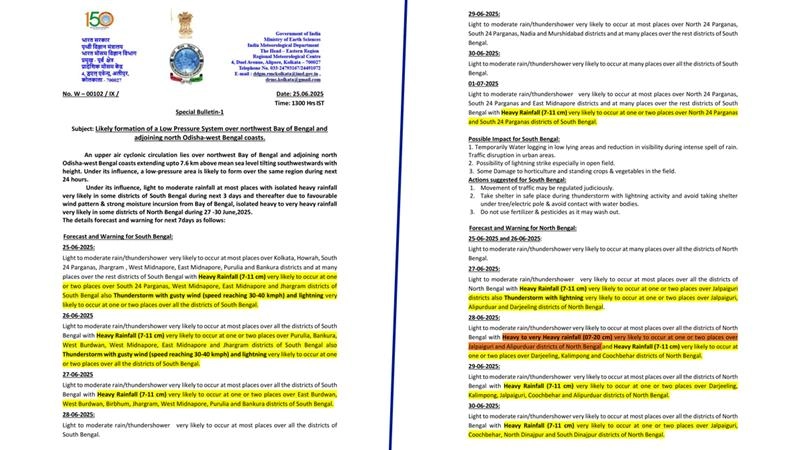 অন্যদিকে উত্তরবঙ্গে জলপাইগুড়ি, আলিপুরদুয়ার, কোচবিহারে ভারী বৃষ্টির পূর্বাভাস রয়েছে। জারি রয়েছে হলুদ সর্তকতা। শুক্রবার সব জেলাতেই হালকা থেকে মাঝারি বৃষ্টি হতে পারে। শনিবার জলপাইগুড়ি, কালিম্পং, আলিপুরদুয়ার, কোচবিহারে ভারী বৃষ্টির সতর্কতা রয়েছে। রবিবার দার্জিলিং, জলপাইগুড়ি, কালিম্পং, আলিপুরদুয়ার, কোচবিহারে ভারী বৃষ্টির সতর্কতা জারি করেছে।আজ থেকে ১ জুলাই পর্যন্ত উত্তরবঙ্গের সব জেলায় বৃষ্টির পূর্বাভাস দিয়েছে হাওয়া অফিস
